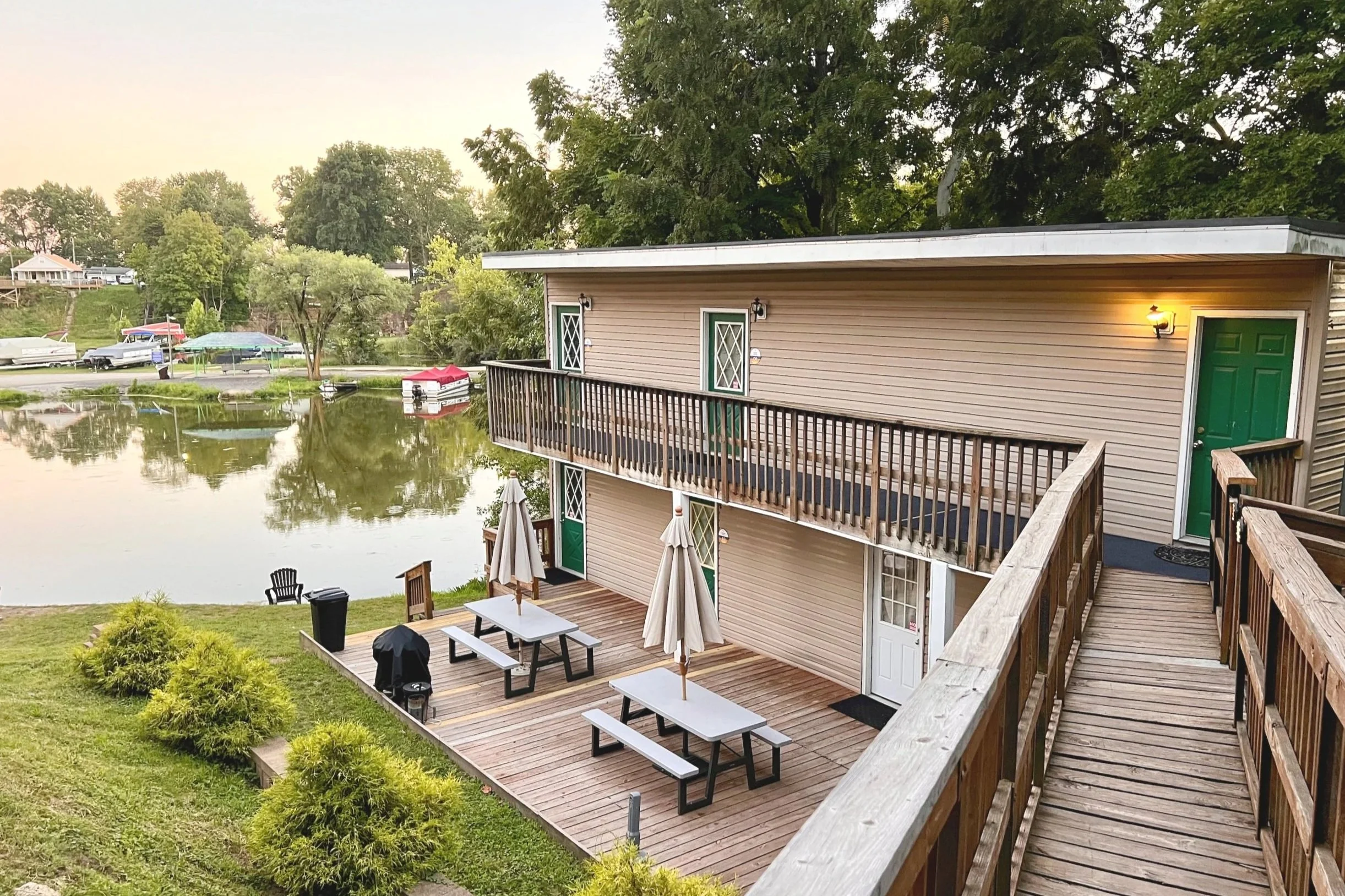 Our completely renovated Studios are a comfortable, budget-friendly option for couples and small families. Each Studios includes a simple kitchenette and easy access to a shared outdoor deck with picnic tables and grills. Studios are located near the fire pit and the fishing bay — perfect for a relaxed lake getaway.